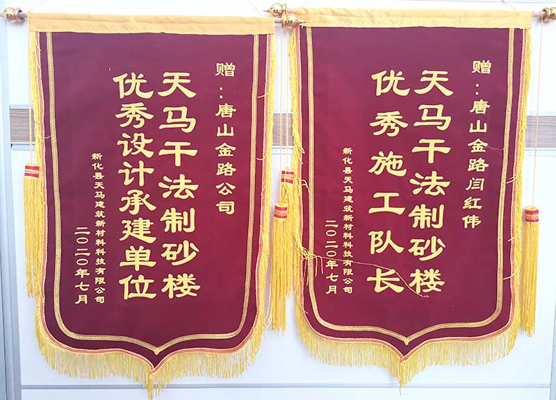 近日,天馬建筑項目負責人將兩面印有“天馬干法制砂樓,優秀設計承建單位”、“天馬干法制砂樓,優秀施工隊長”的錦旗送到了唐山金路安裝隊長閆紅偉的手上。